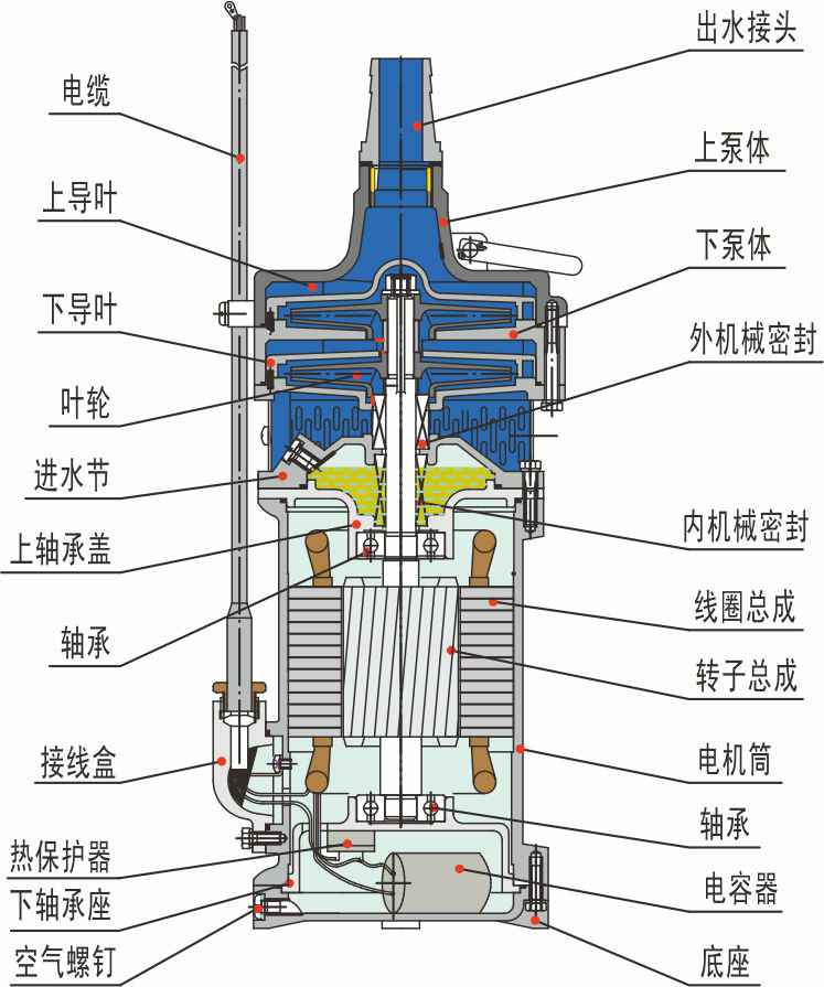 QD.Q小型多级潜水电泵由水泵、密封和电动机三部分组成,电动机位于水泵下部,为三相或单相异步电动机;水泵位于电泵上部,为多级离心式叶轮、径向导叶结构;水泵与电动机之间采用内外两道机械密封,各固定止口处采用“O”型耐油橡胶密封圈作静密封。